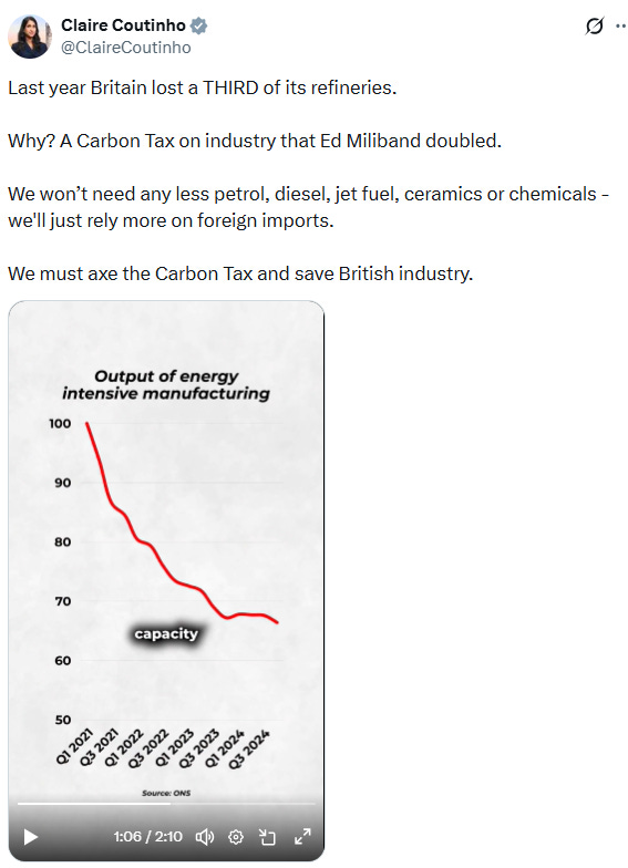 If you want evidence of how carbon taxes have destroyed energy-intensive industry in the UK, the former DESNZ Minister, Claire Coutinho, included a chart in her X post of the UK’s collapsing energy-intensive industry from Q1 2021 to Q3 2024, but forgot to mention that this period was mostly under Conservative governments, not Ed Miliband. I must also correct her: Ed Miliband has NOT doubled any of the carbon taxes on electricity, as the former Energy Minister claims. (shown below.)
